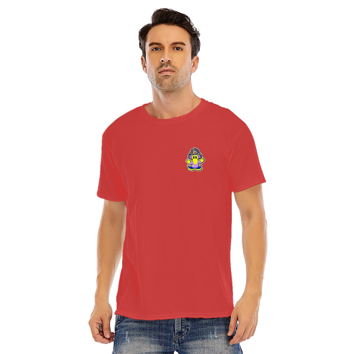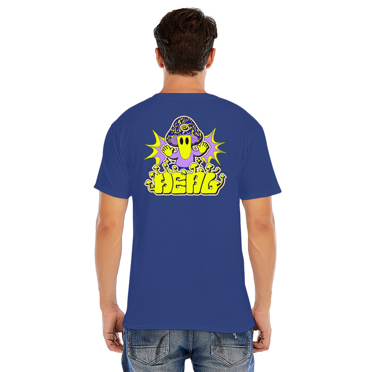 This tee turns the concept of plant medicine into streetwear optimism. The front features a minimalist mushroom figure with cosmic vibes, while the back explodes into full-color cartoon clarity — bold yellow typography, glowing outlines, and a troop of tiny fungi at its feet.